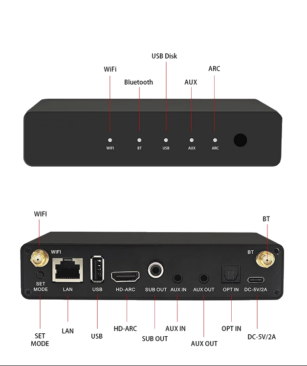 SA100 ist ein Verstärker, der es Ihrer Heimstereoanlage ermöglicht, Sounds über WiFi, Airplay, Bluetooth 5.0 in Ihrem Haus zu streamen und kann einfach an Wand oder Decke installiert werden. Integriert mit reichhaltigen Schnittstellen ist es mit den meisten Ihrer Heimaudiogeräte wie Audioempfängern, Subwoofern und Fernsehern kompatibel.
