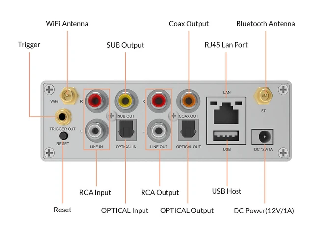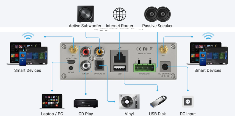 SA100 ist ein Verstärker, der es Ihrer Heimstereoanlage ermöglicht, Sounds über WiFi, Airplay, Bluetooth 5.0 in Ihrem Haus zu streamen und kann einfach an Wand oder Decke installiert werden. Integriert mit reichhaltigen Schnittstellen ist es mit den meisten Ihrer Heimaudiogeräte wie Audioempfängern, Subwoofern und Fernsehern kompatibel.